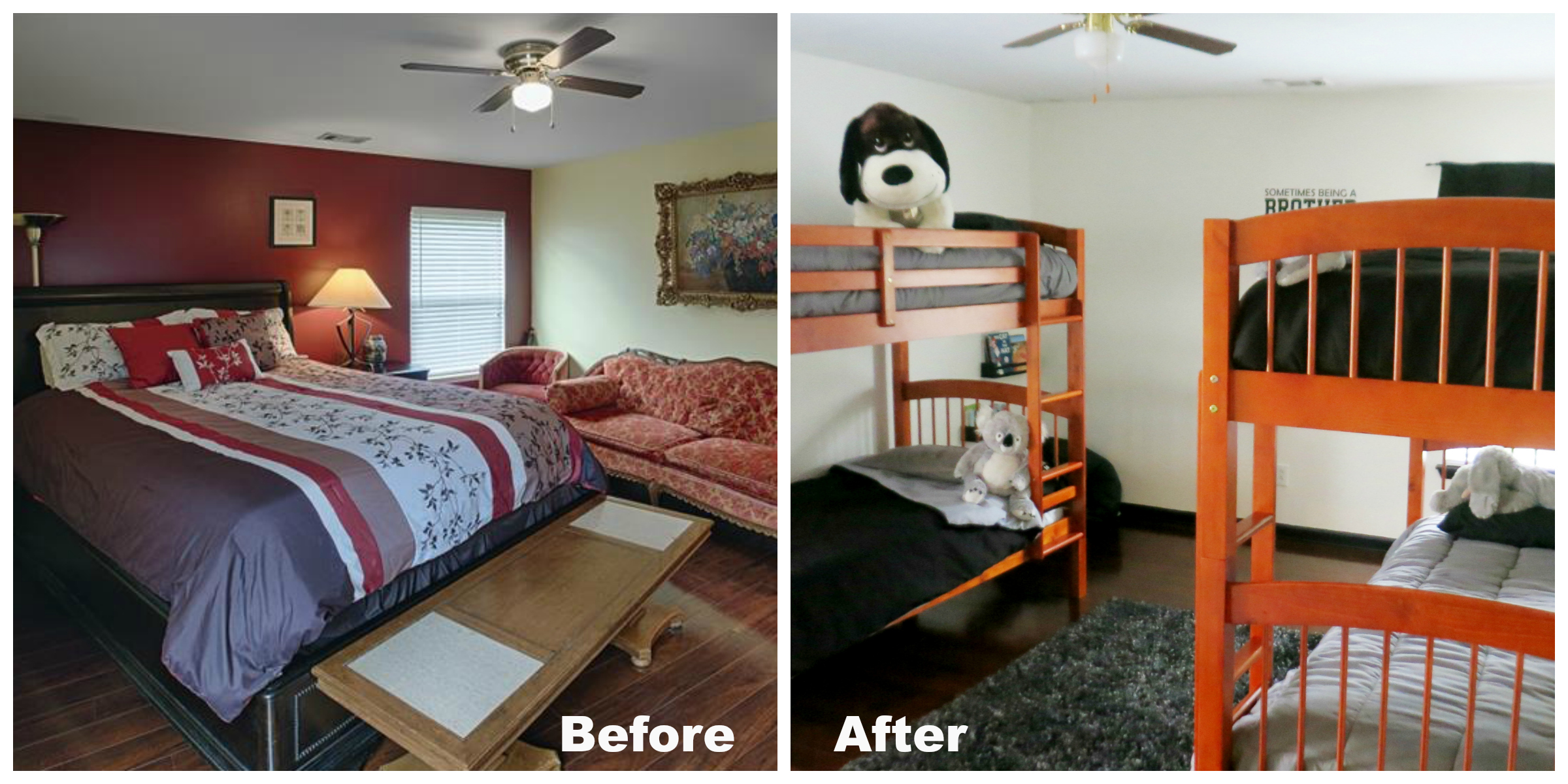 The before picture is from the listing of the house so the previous owners decor, as you can see I went with a simple black and white scheme instead of the burgundy and yellow that we inherited. We put two bunk beds in the room because our boys love to have sleepovers and now there is enough room for everybody!
