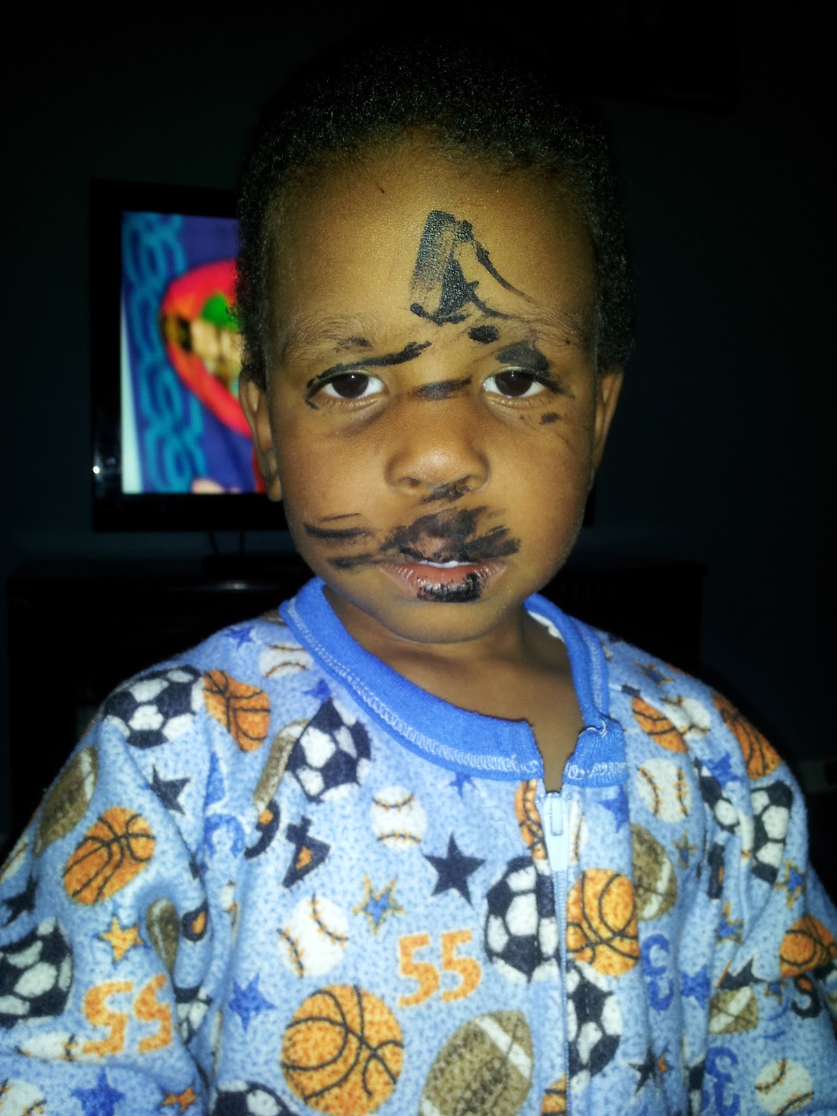 Just last week my 3 year old greeted me by saying, “Good afternoon”like he always does after nap time. I turned to embrace him and was confronted with the adorable face you see below. Your eyes are not playing tricks on you my precious son somehow snuck my eyeliner into his bedroom and turned his face into a one of a kind piece of art! This is one of the stickiest situations I have been put in as a mom. Lesson learned this mom will be incorporating a pat down into our nap time routine!